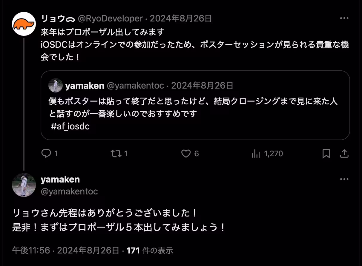 その後iOSDCのリキャップイベントでyamakenさんとお話しする機会があり、来年はプロポーザルを出そうと決めネタを考え始めました。